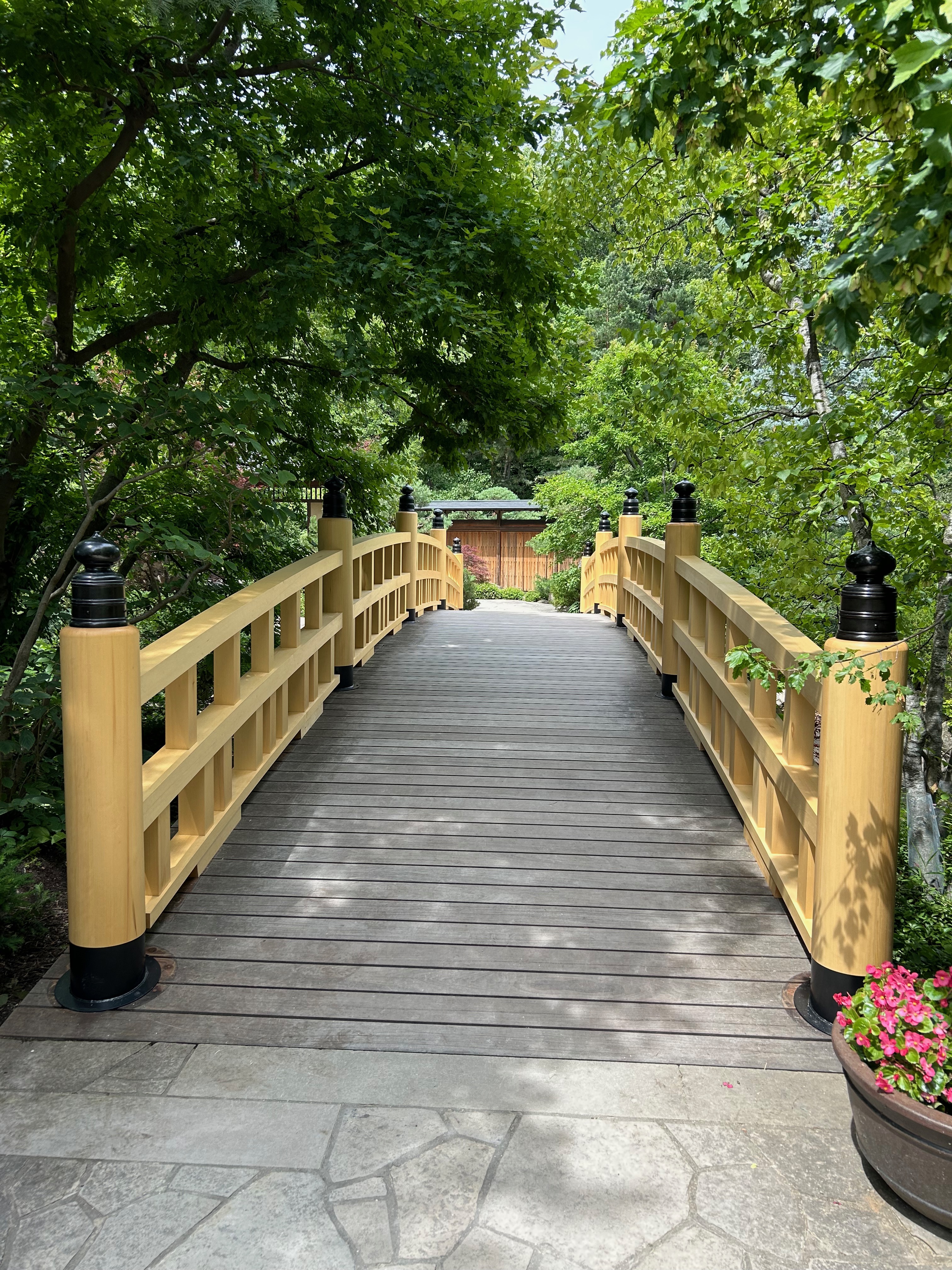 Arched bridge, 100′ long, round top rails and posts that are 24″ tall. The bridge leads to 3 islands that showcase the Japanese garden within the botanic garden.